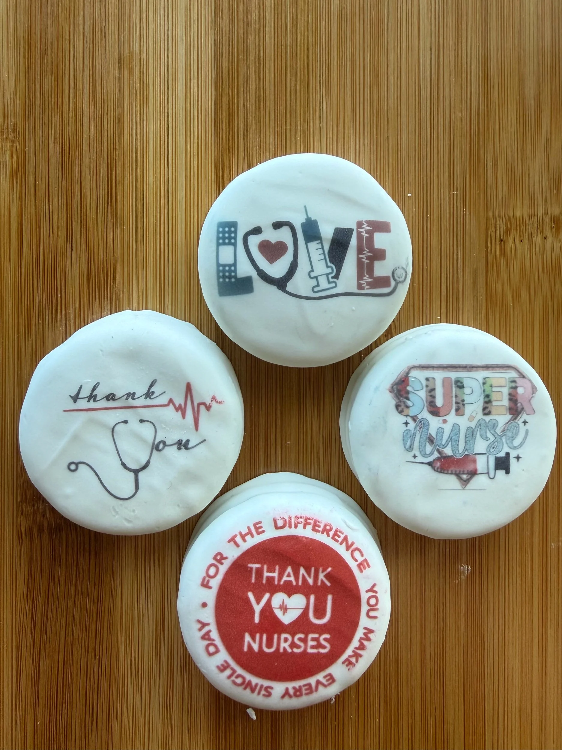 A packaged set of 4 white-fudge–covered Oreos, each adorned with a cute image to thank nurses for all their hard work.
